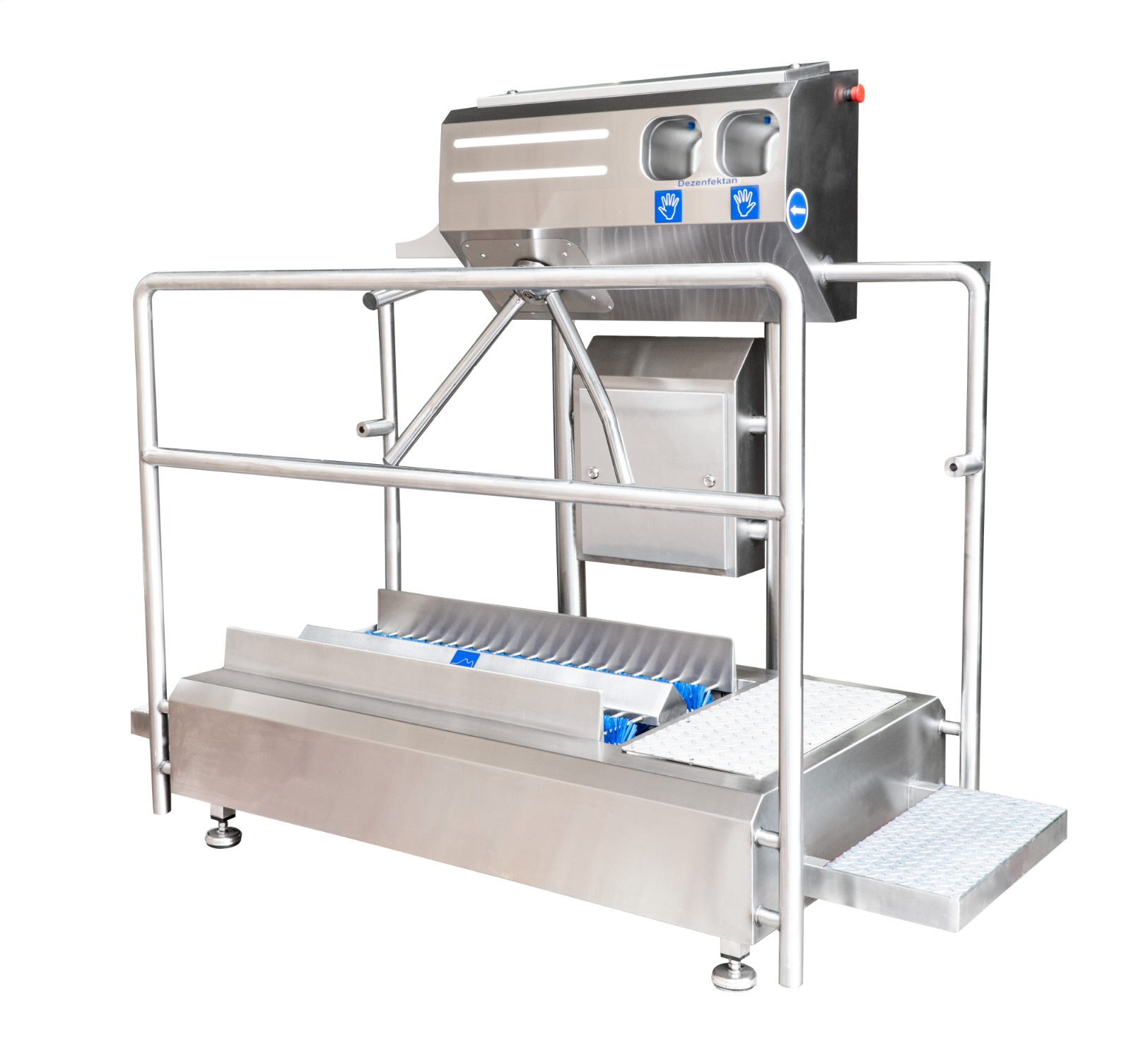 Основными функциями являются дезинфекция рук и подошв обуви. Пропускная способность в базовой комплектации до 20 человек за 1 минуту.
