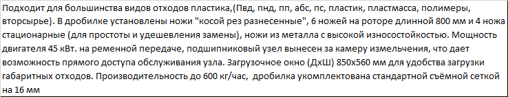 | Подходит для большинства видов отходов пластика,(Пвд, пнд, пп, абс, пс, пластик, пластмасса, полимеры, вторсырье). В дробилке установлены ножи "косой рез разнесенные", 6 ножей на роторе длинной 800 мм и 4 ножа стационарные (для простоты и удешевления замены), ножи из металла с высокой износостойкостью. Мощность двигателя 45 кВт. на ременной передаче, подшипниковый узел вынесен за камеру измельчения, что дает возможность прямого доступа обслуживания узла. Загрузочное окно (ДхШ) 850x560 мм для удобства загрузки габаритных отходов. Производительность до 600 кг/час, дробилка укомплектована стандартной съёмной сеткой на 16 мм |