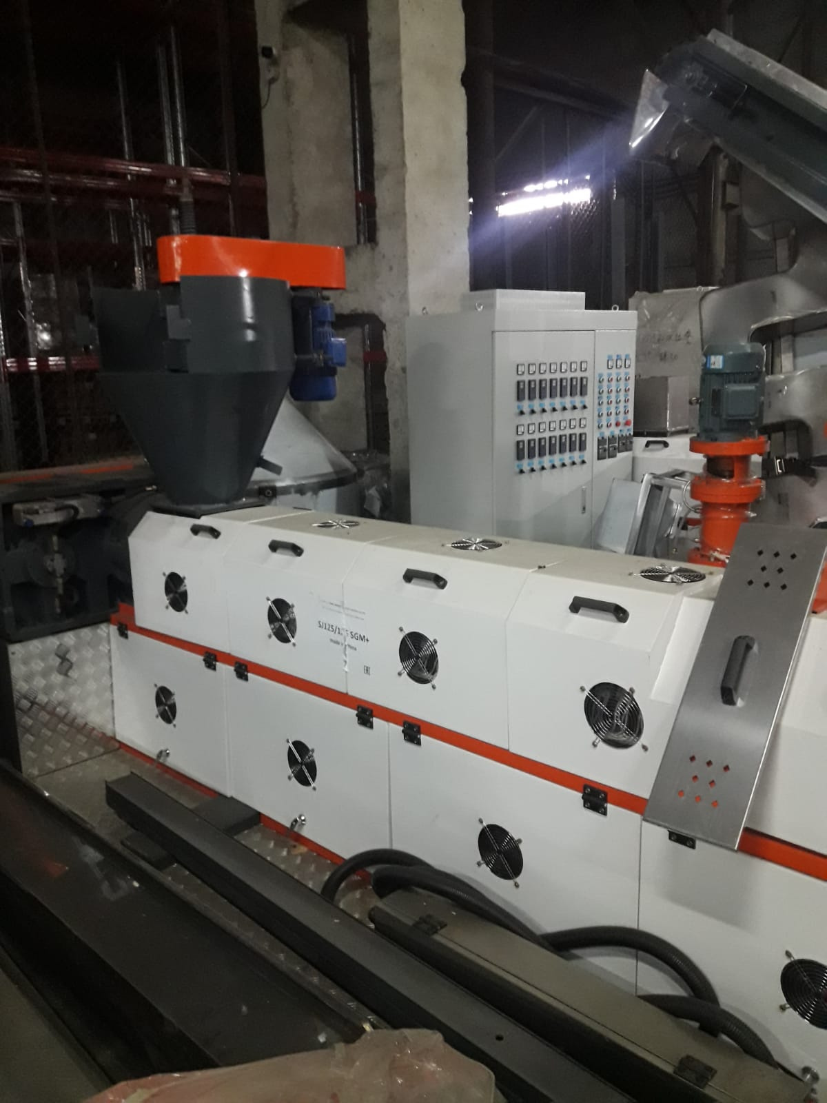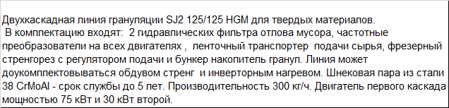 | Двухкаскадная линия грануляции SJ2 125/125 HGM для твердых материалов. В комплектацию входят: 2 гидравлических фильтра отлова мусора, частотные преобразователи на всех двигателях , ленточный транспортер подачи сырья, фрезерный стренгорез с регулятором подачи и бункер накопитель гранул. Линия может доукомплектовываться обдувом стренг и инверторным нагревом. Шнековая пара из стали 38 CrMoAl - срок службы до 5 лет. Производительность 300 кг/ч. Двигатель первого каскада мощностью 75 кВт и 30 кВт второй. |