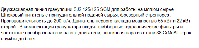 | Двухкаскадная линия грануляции SJ2 125/125 SGM для работы на мягком сырье Шнековый питатель с принудительной подачей сырья, фрезерный стренгорез . Производительность до 200 кг/ч. Двигатель первого каскада мощностью 55 кВт и 22 кВт второй. В комплектации гранулятора входят шибберные гидравлические фильтры и частотные преобразователи на все двигатели, шнековая пара из стали 38 CrMoAl - срок службы до 5 лет. |