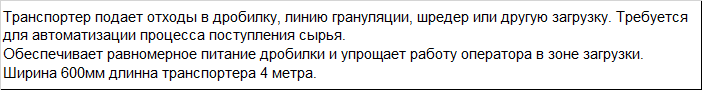 | Транспортер подает отходы в дробилку, линию грануляции, шредер или другую загрузку. Требуется для автоматизации процесса поступления сырья. Обеспечивает равномерное питание дробилки и упрощает работу оператора в зоне загрузки. Ширина 600мм длинна транспортера 4 метра. |