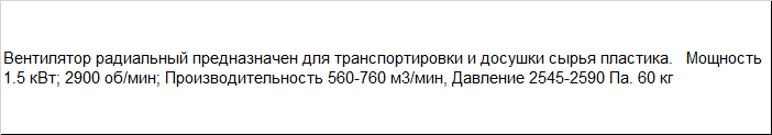 | Вентилятор радиальный предназначен для транспортировки и досушки сырья пластика. Мощность 1.5 кВт; 2900 об/мин; Производительность 560-760 м3/мин, Давление 2545-2590 Па. 60 кг |