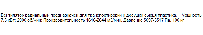 | Вентилятор радиальный предназначен для транспортировки и досушки сырья пластика. Мощность 7.5 кВт; 2900 об/мин; Производительность 1610-2844 м3/мин, Давление 5697-5517 Па. 100 кг |
