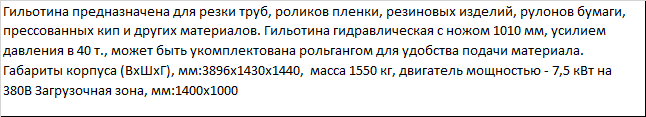 | Гильотина предназначена для резки труб, роликов пленки, резиновых изделий, рулонов бумаги, прессованных кип и других материалов. Гильотина гидравлическая с ножом 1010 мм, усилием давления в 40 т., может быть укомплектована рольгангом для удобства подачи материала. Габариты корпуса (ВхШхГ), мм:3896x1430x1440, масса 1550 кг, двигатель мощностью - 7,5 кВт на 380В Загрузочная зона, мм:1400х1000 |