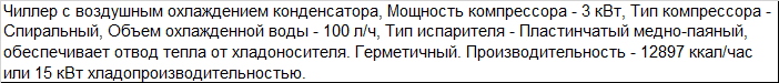 | Чиллер с воздушным охлаждением конденсатора, Мощность компрессора - 3 кВт, Тип компрессора - Спиральный, Объем охлажденной воды - 100 л/ч, Тип испарителя - Пластинчатый медно-паяный, обеспечивает отвод тепла от хладоносителя. Герметичный. Производительность - 12897 ккал/час или 15 кВт хладопроизводительностью. |