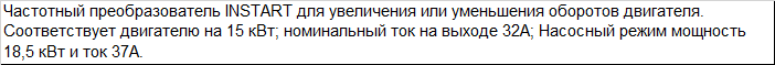 | Частотный преобразователь INSTART для увеличения или уменьшения оборотов двигателя. Соответствует двигателю на 15 кВт; номинальный ток на выходе 32А; Насосный режим мощность 18,5 кВт и ток 37А. |