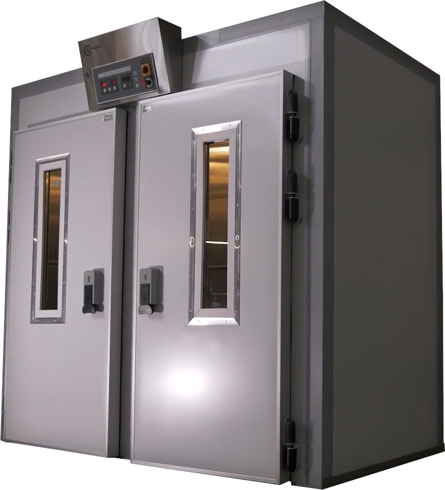 «Климат-Агро» ‒ это серия специализированных тепловых устройств, в которых идет окончательная расстойка формованных, подготовленных к выпечке изделий. Это оборудование ускоряет восстановление нарушенной во время формовки пористой структуры теста, и обеспечивает возможность в более короткие сроки производить хлебобулочные и кондитерские изделия лучшего качества. Разнообразие модельного ряда агрегатов позволяет заказчику купить расстойный шкаф, рассчитанный на одновременную загрузку от 2 до 9 стеллажных тележек. Предлагаемые модели оборудования «Климат-Агро» различаются фронтальными размерами и глубиной шкафа (обозначается в дюймах), возможными вариантами фронтального или туннельного исполнения, а также наличия теплоизолированного пола. В каталоге продукции Тверского завода ТвЗХО представлено 10 базовых моделей изотермического расстойного оборудования различных габаритов и объемов климатической камеры. При сборке изотермических шкафов Климат-Агро применяются эффективные теплоизоляционные сэндвич панели и многофункциональные климатические установки с адаптивным программным управлением. Основное преимущество такой техники – универсальность применения. Использовать расстоечный шкаф Климат-Агро можно в условиях небольших мехпекарен, заведений общепита, магазинов, супермаркетов, кондитерских. Готовые изделия будут пышными, сдобными, сохраняя свойства после остывания долгое время.