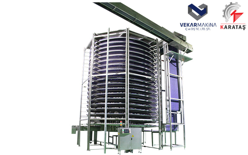 Хлеб, булочки, рогалики, кондитерские изделия, круассаны, пирожные и т.д. в пищевой промышленности. Спиральные конвейерные системы, используемые для транспортировки различных продуктов.