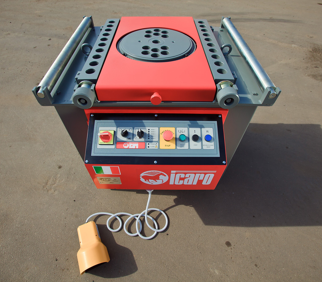 Станки для гибки арматуры ICARO осуществляют гибку арматуры диаметром от 6 мм. до 70 мм., как круглого, так и квадратного сечения. Редуктор и кулисный механизм, обладающие высокой степенью надежности, находятся в одном корпусе и имеют общую систему смазки. Можно увеличить скорость выполнения работ, выбирая станок из расчета обработки нескольких стержней арматуры. Станок оснащен электрическими и механическими системами безопасности. Электродвигатель с тормозом позволяет достигать высокой точности угла изгиба. Диск сгибания работает в режиме реверса. Устройство плиты позволяет осуществлять двойной изгиб арматуры. На станки, возможно, установить дополнительные устройства для изгиба большого радиуса, изготовления спиралей, скоб и хомутов.