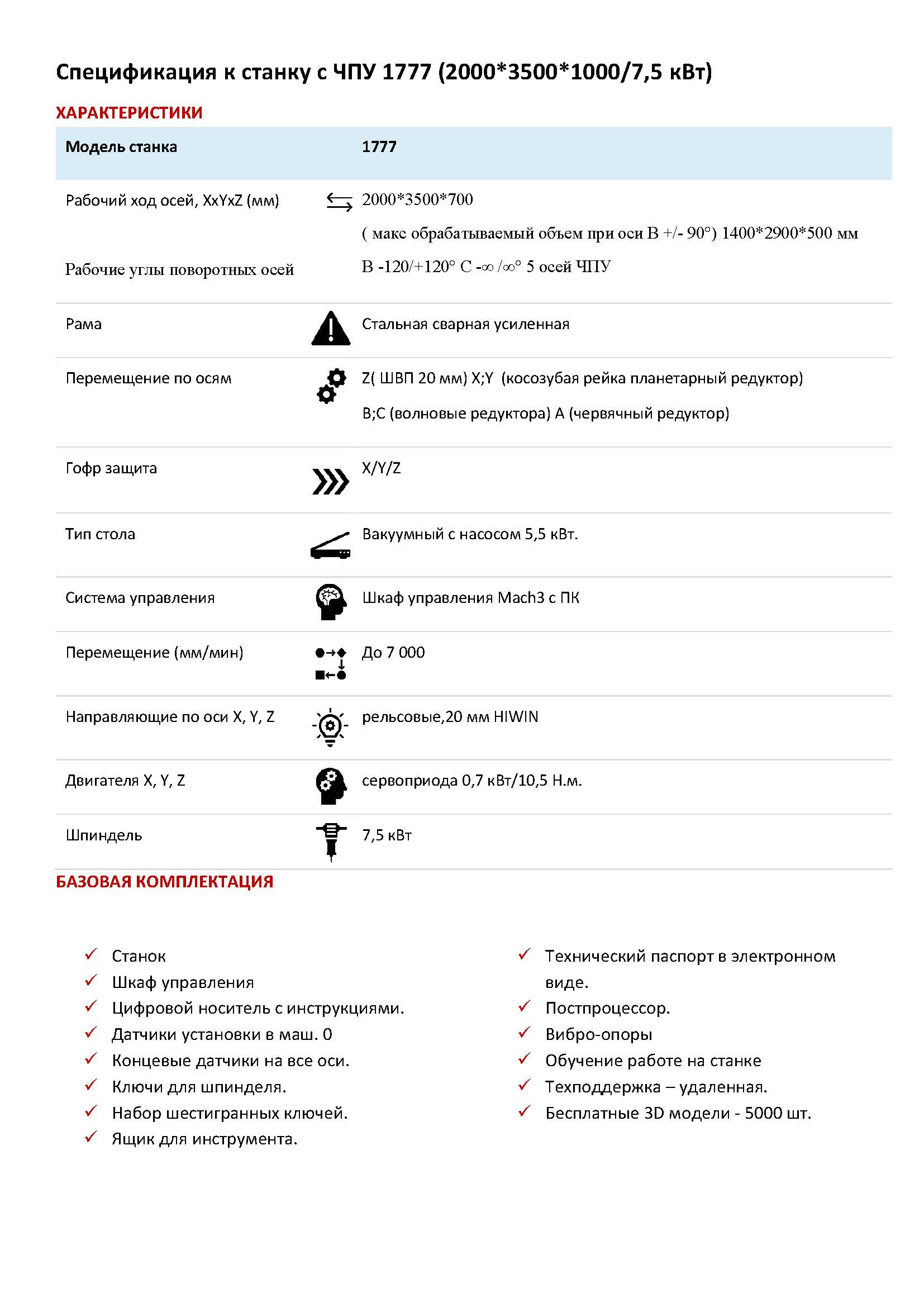 1) Станок с ЧПУ 1777К (2000*3500*700/7.5 кВт/СП/ВС/СПК/5 осей (XYZCB))