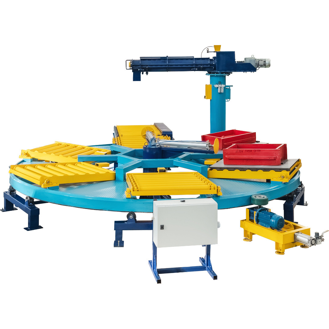 Карусельная установка (далее установка) предназначена для автоматического перемещения заформованной и пустой оснастки. На установке можно организовать изготовление трёх комплектов разных или одинаковых форм, используя шесть модельных оснасток.