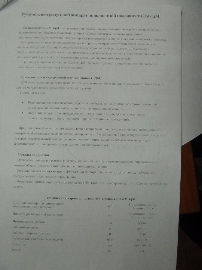 Металлизатор электрический для нанесения покрытий ЭМ14-М