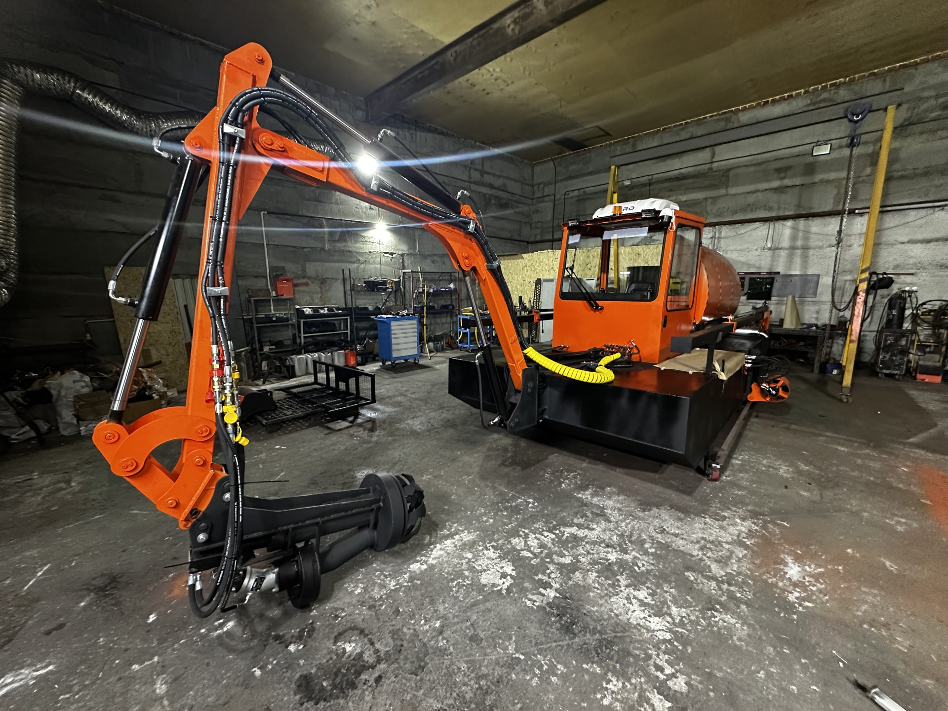 Особенностью этой установки является поворотная экскаваторная стрела с возможностью смены насадок: (ковш, ковш-вилы, фрезерный рыхлитель с насосной установкой). Данная установка способствует захвату грунта со дна водоема, с последующей разгрузкой на берег. Сваи позволяют зафиксировать земснаряд на водоеме во избежание движения во время выполнения работ. Оборудован маневровыми гидравлическими моторами для передвижения на водоеме со скоростью до 5-и км/час.