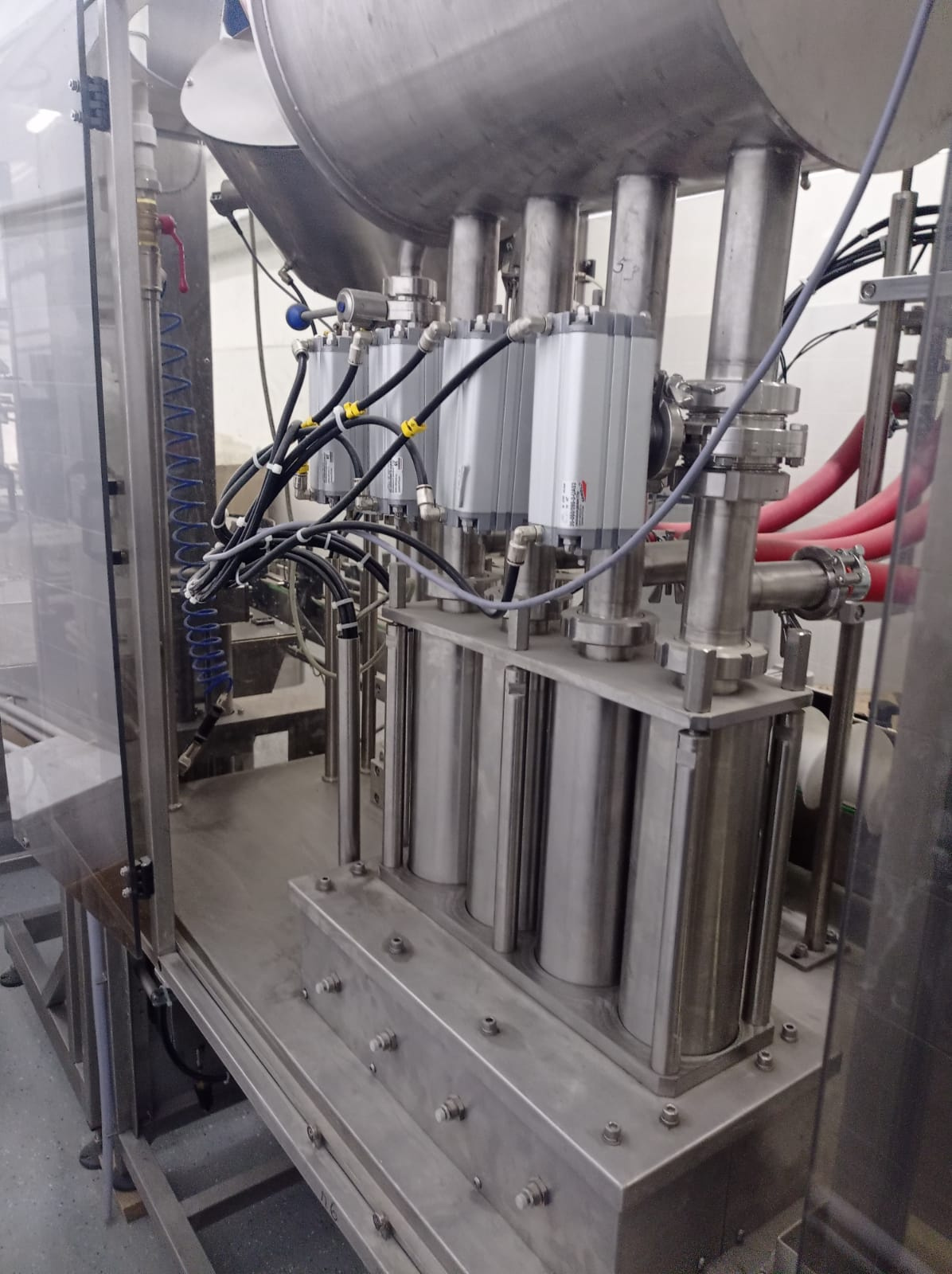 | Дозатор с блоком клапанов. Дозатор предназначен для дозировки расчетной порции продукта в тару. Тип дозатора - поршневой. Привод поршня дозатора осуществляется при помощи пневмоцилиндра. При движении поршня вниз происходит наполнение гильзы дозатора заданной порцией продукта. Во время наполнения дозатора входной клапан открыт, а выходной закрыт. При движении поршня вверх входной клапан закрыт, а выходной открыт, при этом происходит дозирование заданной порции продукта в бутылку. В случае конструкции оборудования предназначенного для подключения к централизованной CIP мойке, дозатор имеет режим автоматической регулировки дозы и оснащен камерой для промывки раствором. |