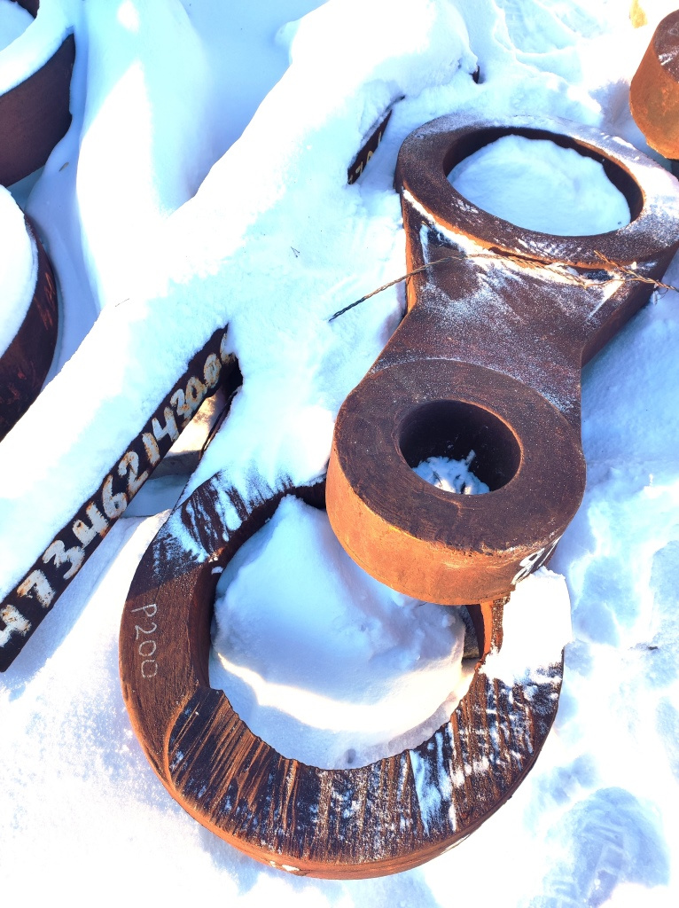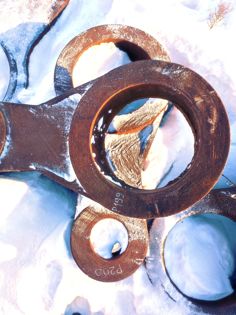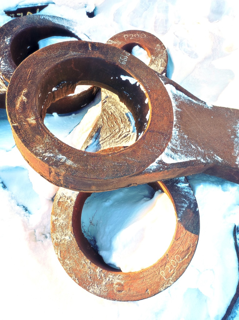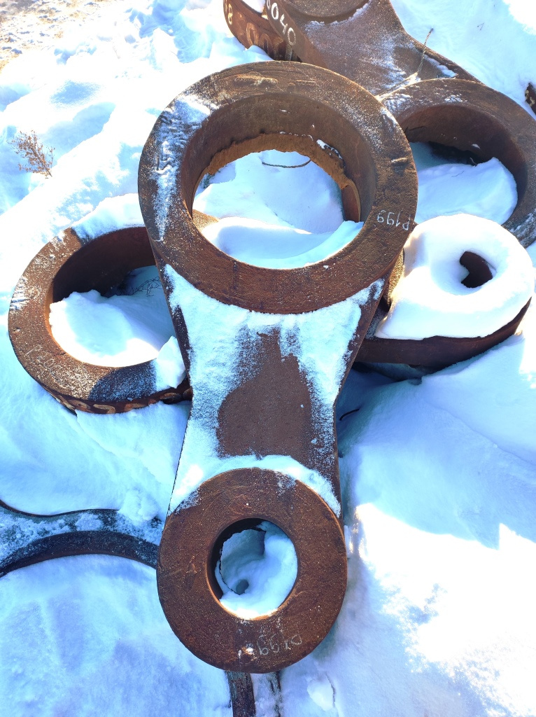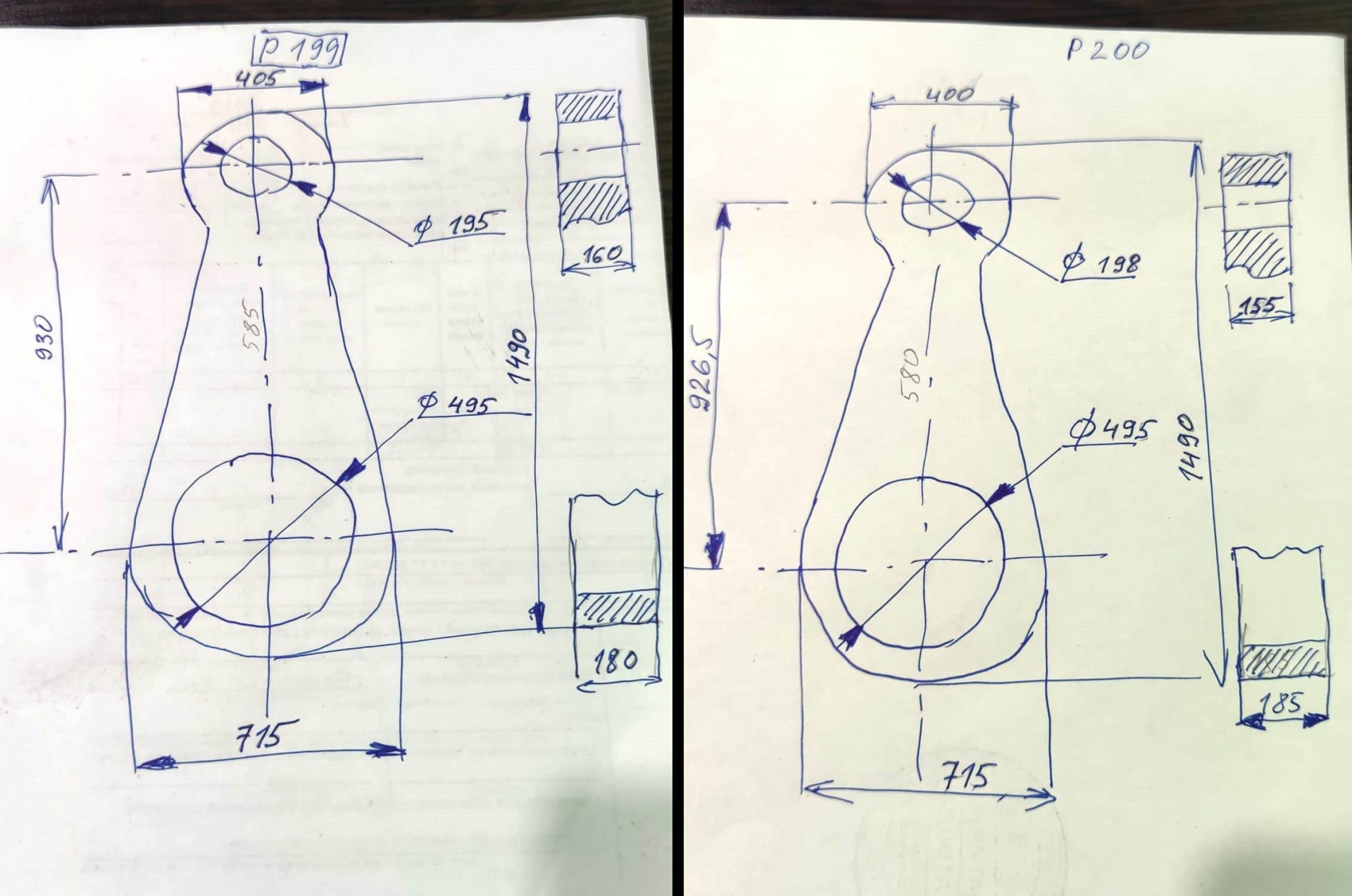 Продам заготовку шатуна (литьё), есть 4 штуки. На фото - P199 и P200. Шатун товарный, не брак, приливы сняты, раковин крупных нет, не гнутый, остался от заказа, материал не известен, перевозился раза два. Цену предлагайте. Нал, безнал, договор, поможем с погрузкой. Размеры: смотрите эскизы на фото (мерил рулеткой): межцентровое - 930мм, диаметры внутр. - 495 и 198мм, толщина - 185 и 155мм, диаметры наруж. - 715 и 400мм, общая длина - 1490мм.