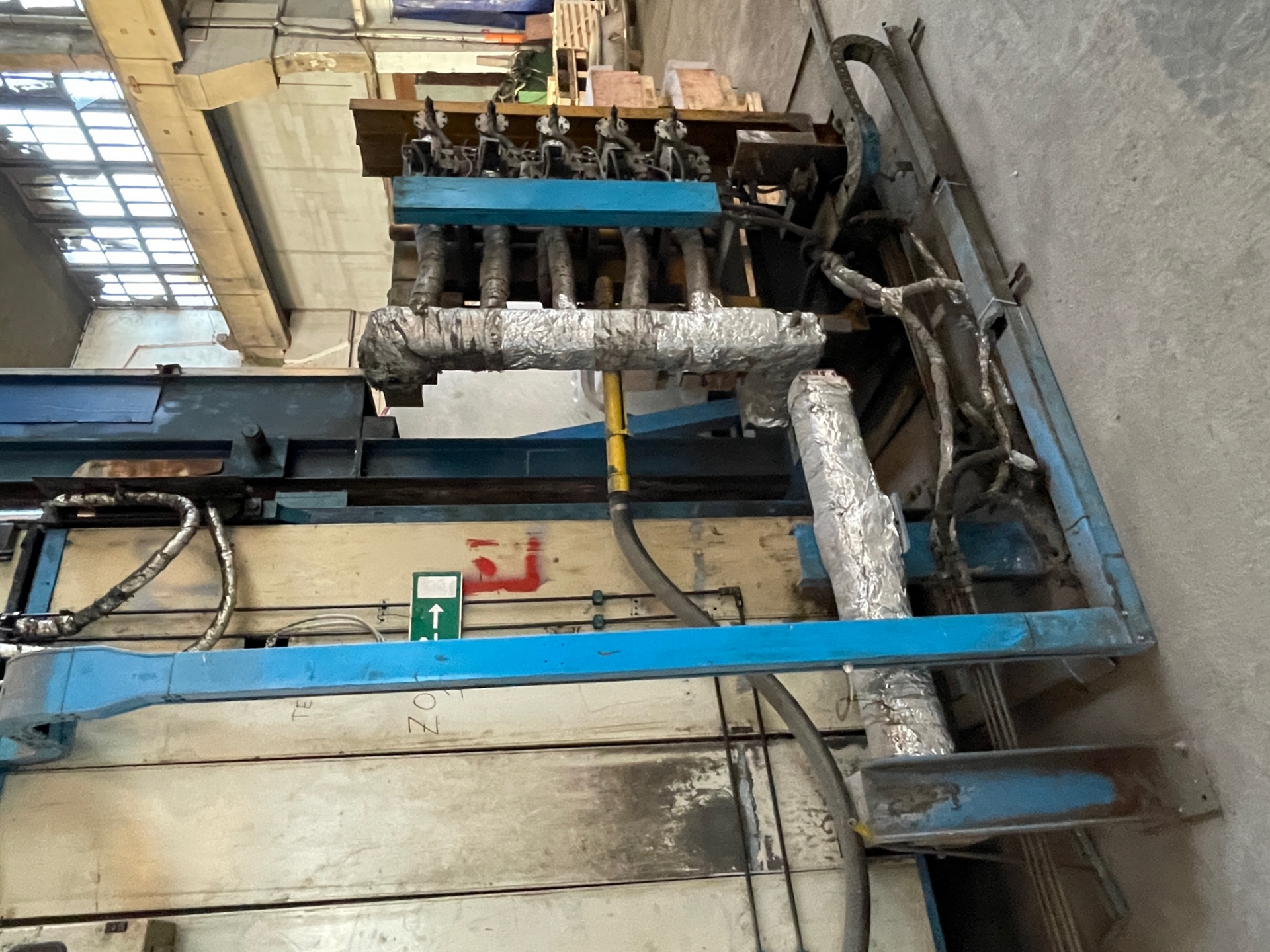Печь Супертурбо периодического действия с температурой обжига до 1150 °С и максимальной температурой 1200 °С, оснащена 24 быстроходными горелками, 1 кареткой внутри камеры, 1 вертикальной дверью, обратными индукционными дымоходами, удлинителем дымоудаления, автоматикой. пульт управления с АТР 313, футеровка из керамического волокна высокой плотности, тип 1260°С; 4 Теплообменники для горячего воздуха для горения.
