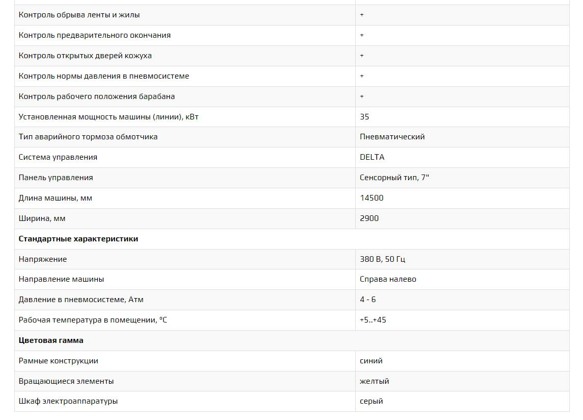 Машина состоит из станков оснащённых индивидуальными приводами с управлением от общего контроллера. Для ввода параметров и визуализации состояния процесса применяется сенсорная панель оператора (ОП). Удобное пользовательское меню на базе разработанной нашими инженерами программы требует ввода 3-х основных параметров (скорость машины, шаг наложения лент, усилие натяжения на размотке и намотке кабельного изделия) для активации машины. Система управления поддерживает задачу автоматически. Значения параметров могут быть скорректированы оператором в процессе работы линии и приняты к действию системой управления (СУ).