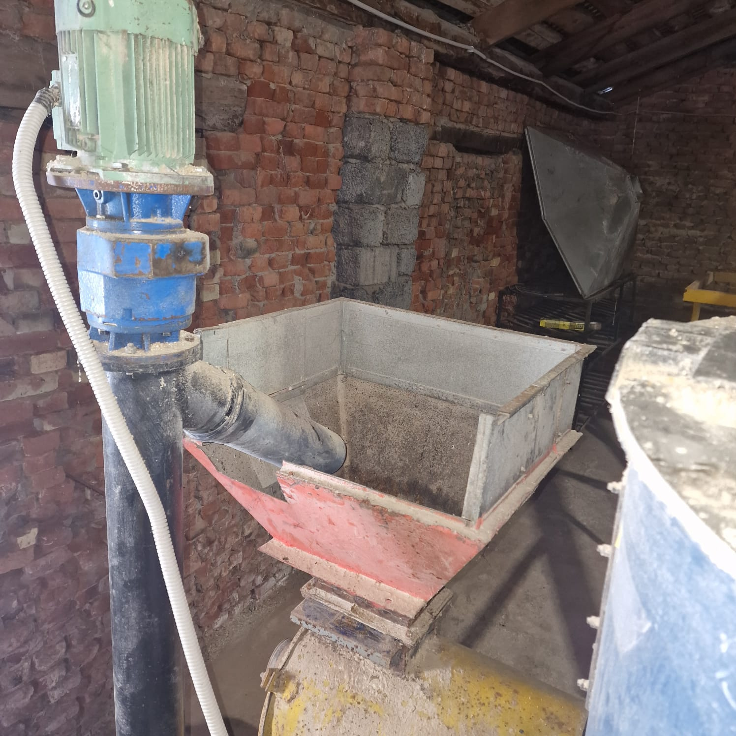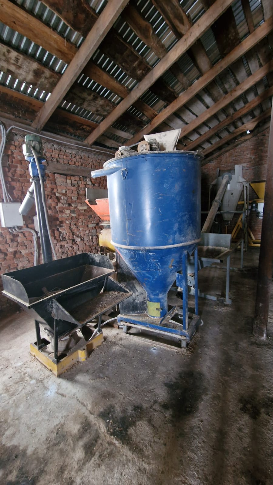 1 приёмный бункер 150 литра с вертикальным шнеком и электродвигателем 2квт - для подачи сырья в дробилку.