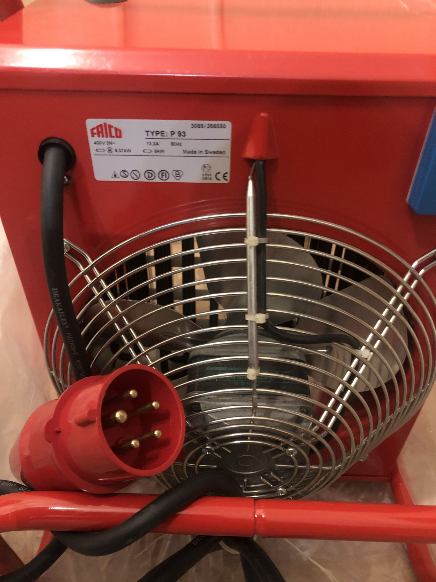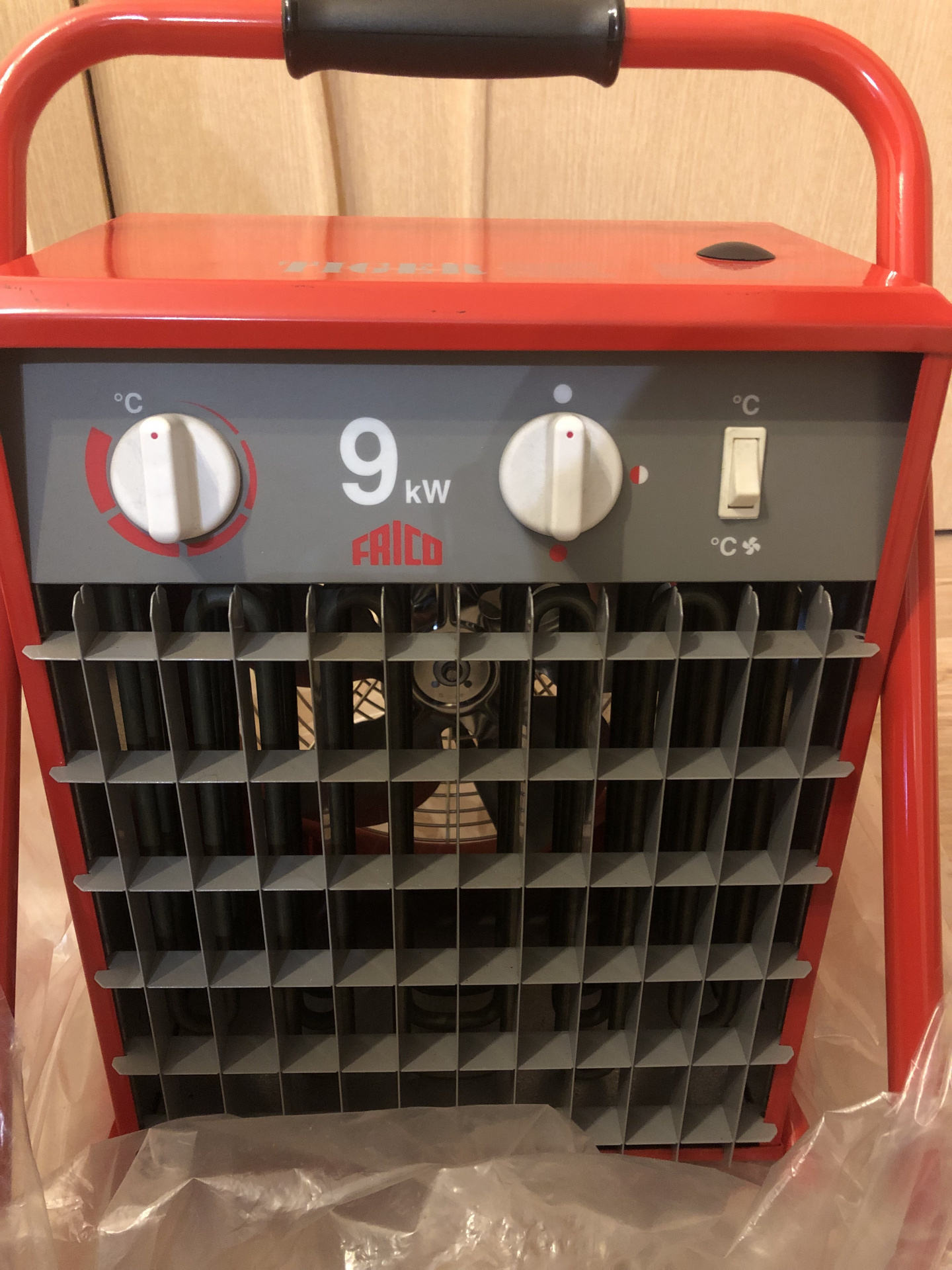 Тепловентилятор Frico P93 серия Tiger. Мощность до 9 кВт, ступенчатая регулировка мощности (0/4,5/9) кВт, напряжение 380 В, термостат от 5 до 35 градусов, защита от перегрева, класс защиты IP44, вес 10 кг.
