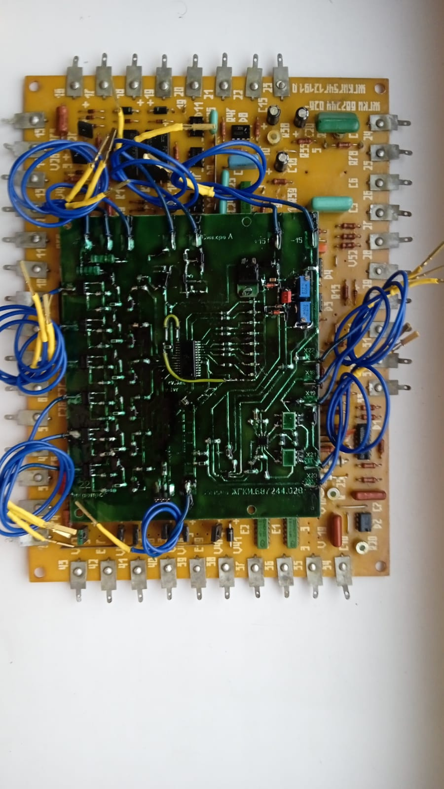 Плата аналог ЖГКИ687244028 (ЖГКИ 7547121910) для ее замены в выпрямителях гальваники. Увеличивает срок работы платы без настроек. Более десяти выпрямителей ТВ,ТВР около двух лет работают на этих платах на одном из предприятий без каких либо нареканий к работе. А старые платы очень часто надо было настраивать, а то и ремонтировать. При замене платы половина контактов не используется. Устанавливается устройство на штатное место платы в шкафу выпрямителя при помощи дополнительных крепежных элементов, т.к. размер платы меньше оригинальной. Затем присоединяются соединительные провода в соответствии с оригинальной нумерацией. То есть, 45 с 45, 47 с 47, 48 с 48 концы проводов, пробиркованные от платы и выпрямителя. При подаче напряжений на плату загорается светодиод в линейке индикации мощности. Смотрите фотографии.