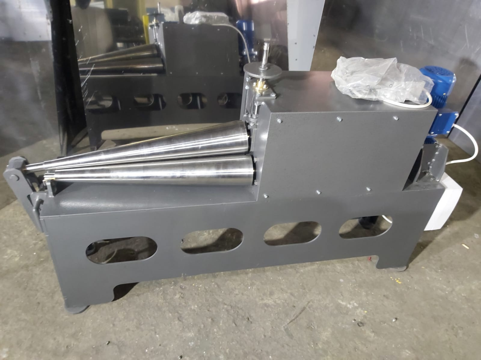 Качественная гибка конусных деталей всегда представляет особую сложность, особенно когда требуется вальцовка деталей малого диаметра или большим углом развертки. Если на обычных вальцах с прямыми валами еще можно изготовить конические детали большого диаметра, то детали малого диаметра изготовить невозможно. Для этих целей требуются специальные вальцы с конусовидными валами и большим диапазоном регулировок.