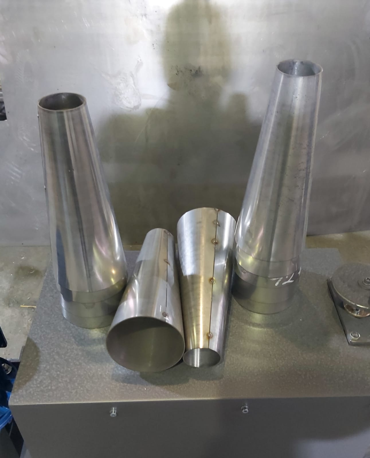 Если на обычных вальцах с прямыми валами еще можно изготовить конические детали большого диаметра, то детали малого диаметра изготовить невозможно. Для этих целей требуются специальные вальцы с конусовидными валами и большим диапазоном регулировок. Нашим предприятием разработаны вальцы позволяющие выполнять вальцовку конусовидных деталей разного диаметра.