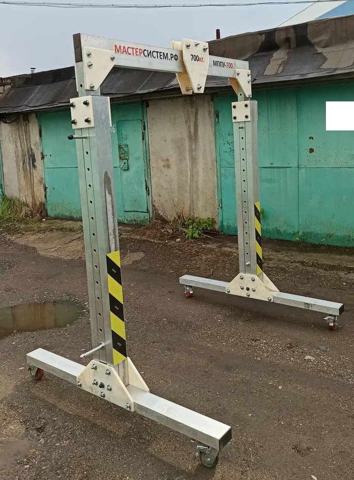 Универсальный-перемещение с грузом. Идеальное решение для работы с крупными габаритными грузами. Легко разборная конструкция, быстрый монтаж и демонтаж без применения специальных инструментов и устройств. Все элементы скрепляются при помощи болтов и винтов. Полностью разборная конструкция. Крановые системы. РФ Кран сборно-разборный, алюминиевый складной кран. Малые грузоподъёмные краны.Данная конструкция «МППУ-700у» сделана, из прессованного усиленного профиля алюминиевых сплавов и системы узловых крепежей из жестких пластмасс. МППУ-700У устанавливается на специальные шасси с учетом передвижения устройства, при поднятом на нем грузе. На усиленных поворотных колесных опорах, с тормозом. Регулируется по высоте и ширине пролёта. Полностью разборная конструкция.