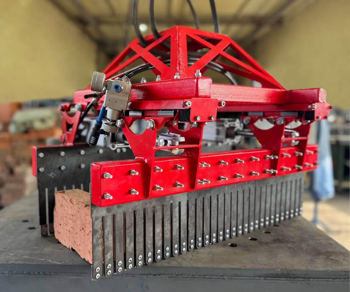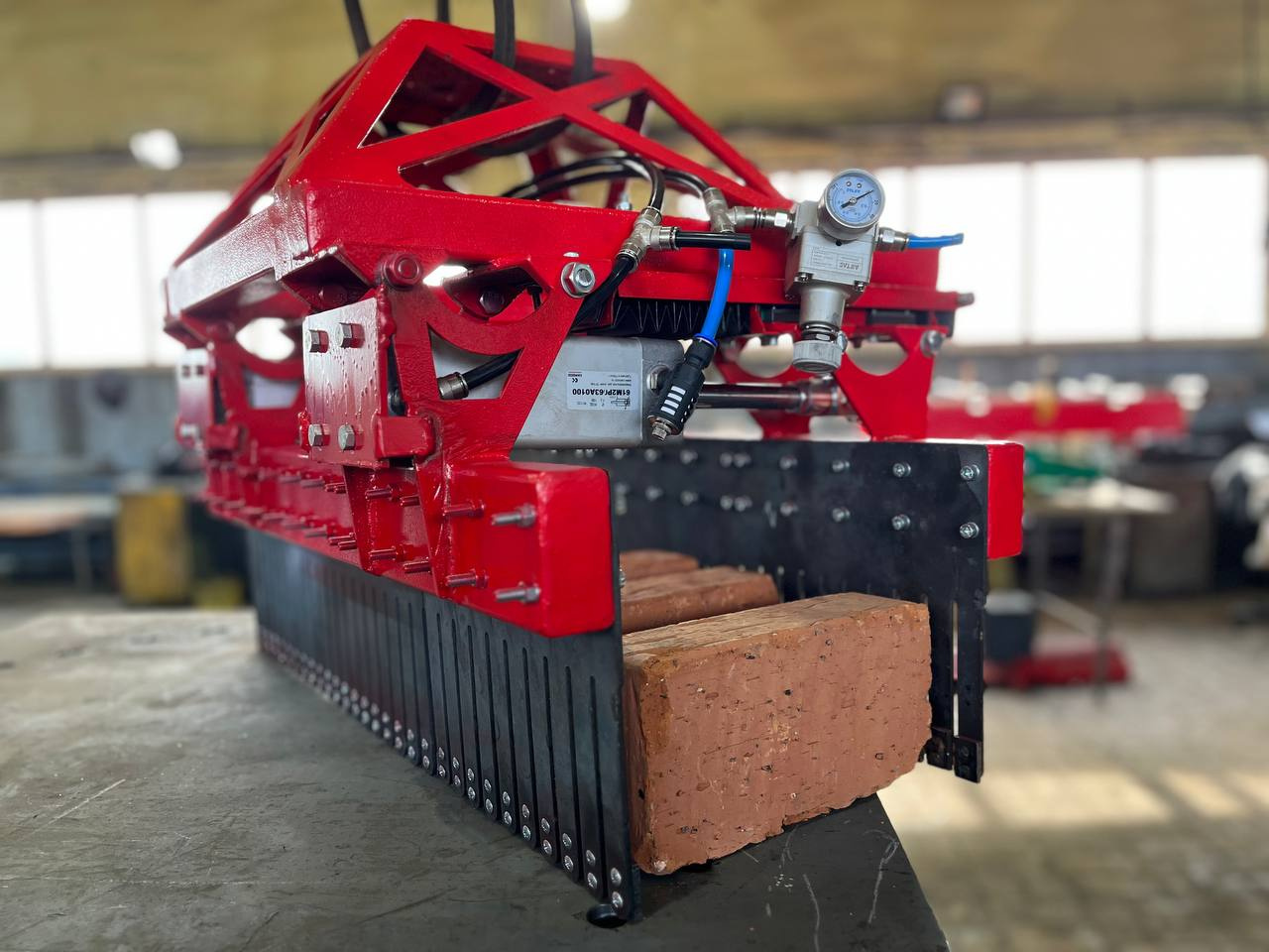 За счет смыкания параллельных губок пневмоцилиндрами обеспечивается надежное удержание кирпича. Пружины губок изготовлены из пружинной стали так, чтобы исключить динамические нагрузки на керамические изделия и скомпенсировать разность размеров кирпичей. Качающиеся самоустанавливающиеся губки компенсируют возможные искажения угловых размеров изделий.