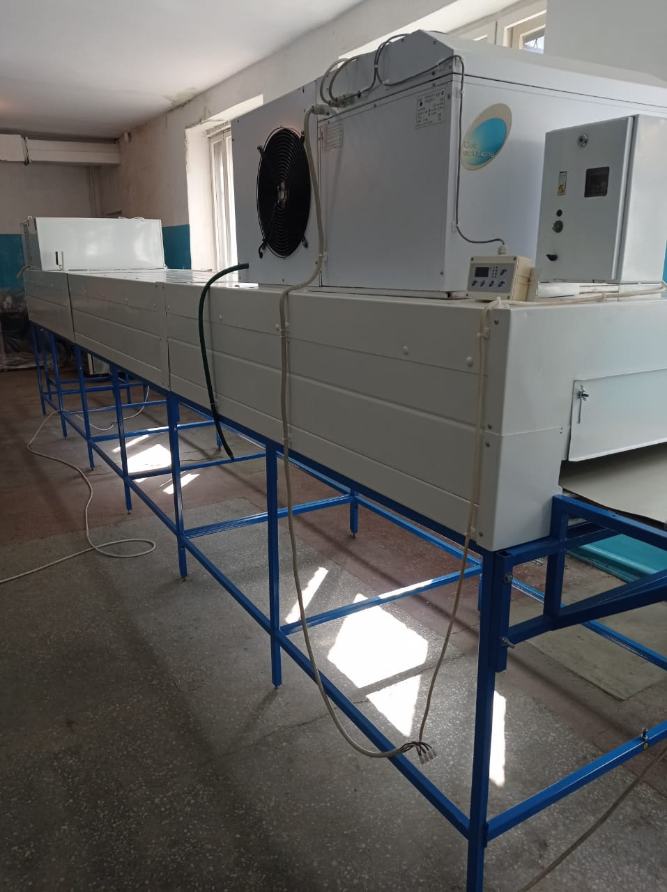 3.Тоннель охлаждающий,3х секционный . С 2мя холодильными агрегатами.Ширина ленты конвейера 620 мм . Длина тоннеля со столами 7 метров.