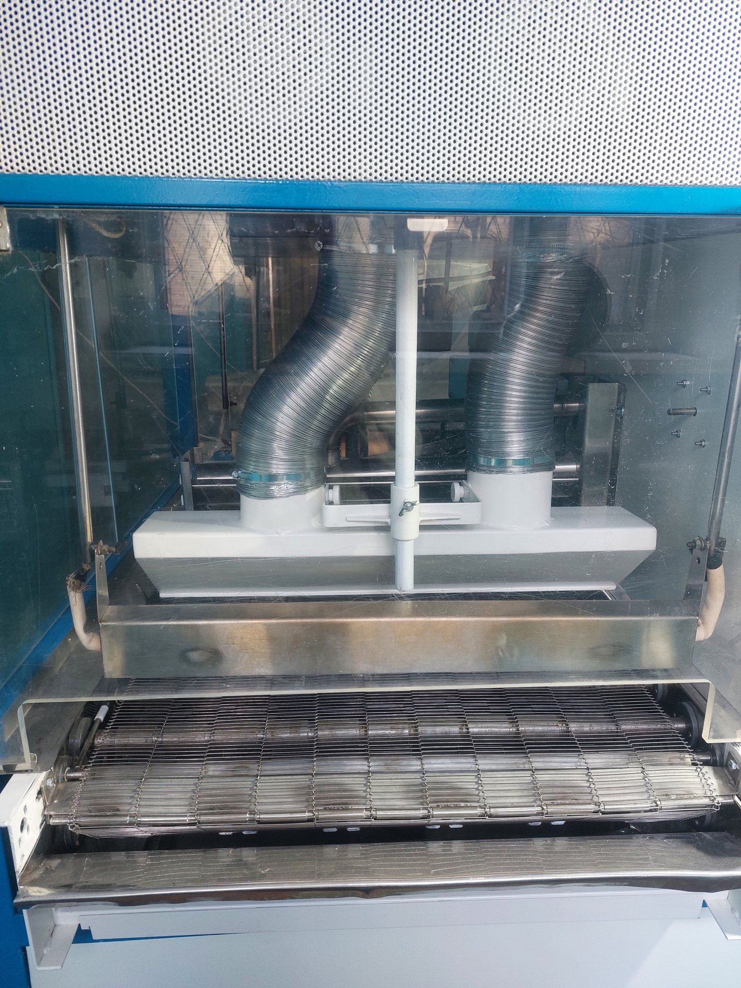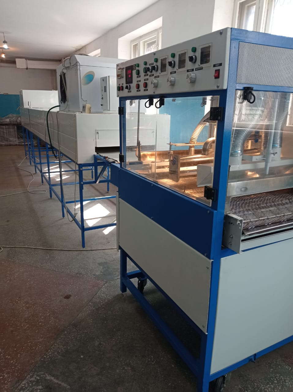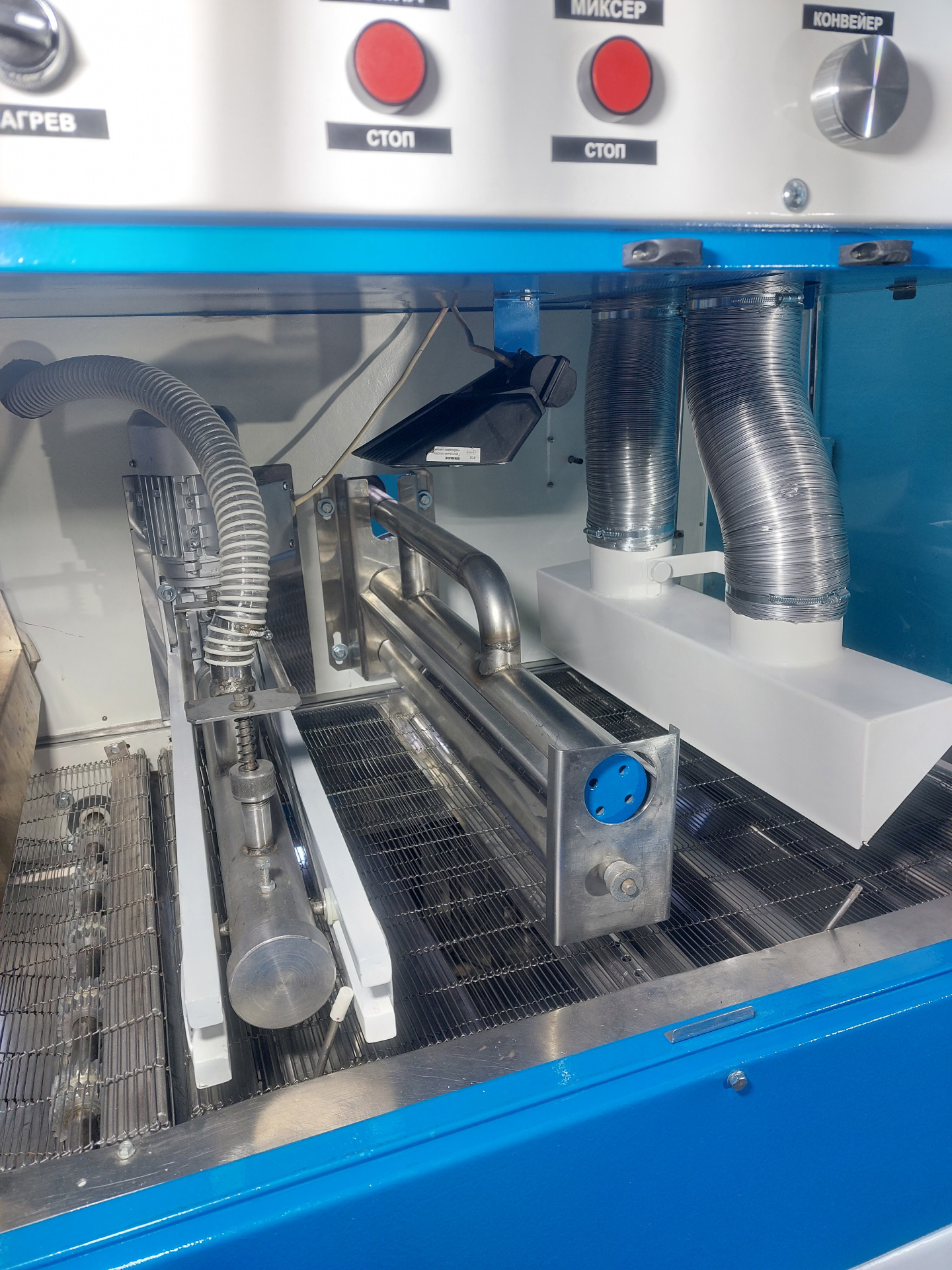 1.Глазировочная машина с шириной сетки 620 мм . Сетка новая. Подогрев камеры тэнами .