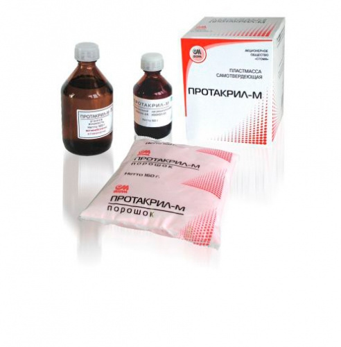 Протакрил М - пластмасса холодной полимеризации, используется для временных пластиночных съемных протезов, ортодонтических аппаратов, съемных шин-протезов, ремонта и реставрация съемных зубных протезов.