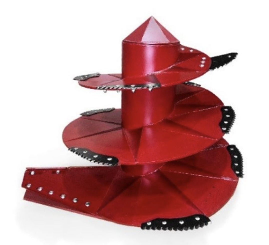 Шнек системы «тайфун» с фиксированным нижним контуром и самозатачивающимися ножами, изготовленными из твёрдого сплава с вольфрамовым напылением, толщина металла 1,3см (возможно увеличение толщины до 1,9см). Благодаря изменяемой геометрии крыльев шнека, значительно интенсифицирует процесс смешивания, ведь активная гомогенизация компонентов кормового состава начинается на самой поверхности крыльев. Посредством радиальных реборд в системе «Тайфун» созданы 23 зоны турбулентности, позволяющие обеспечить интенсивное смешивание ингредиентов за один подъем, что в два раза сокращает время на смешивание и дает значительный экономически выгодный эффект. ( от 8 до 12м3 – 1 шнек, от 18 до 24м3 – 2 шнека, от 30 до 45м3 – 3 шнека)