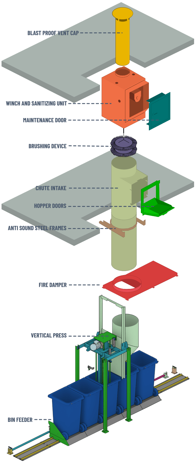 Системы FNP спроектированы таким образом, чтобы быть абсолютно безопасными, бесшумными и эффективными и могут использоваться в любом существующем здании, где есть свободное место в мусоросборнике / комнате в которую выводится труба мусоропровода или лоток мусоросброса.