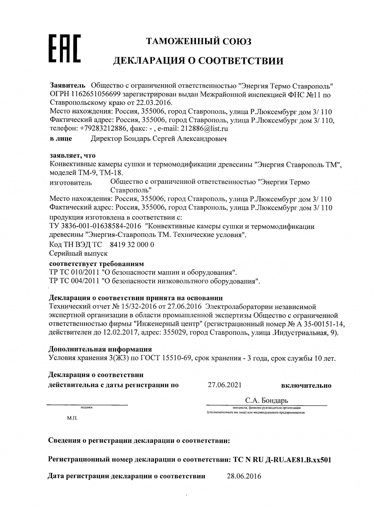Производитель оборудования- ООО «Энергия Термо Ставрополь» г.Ставрополь. Контактный телефон +7 928 321 28 86. Сайты- «сушкалеса.рф», http://www.thermoles.com.