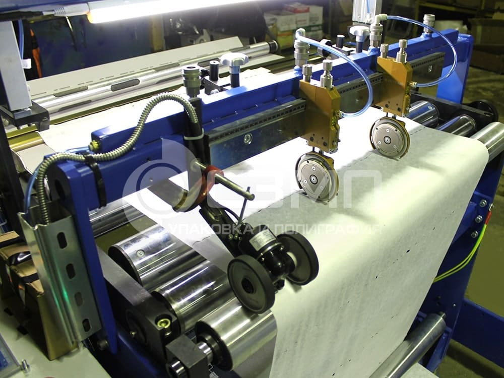 Машина предназначена для производства салфеток, полотенец и простыней из нетканых материалов.