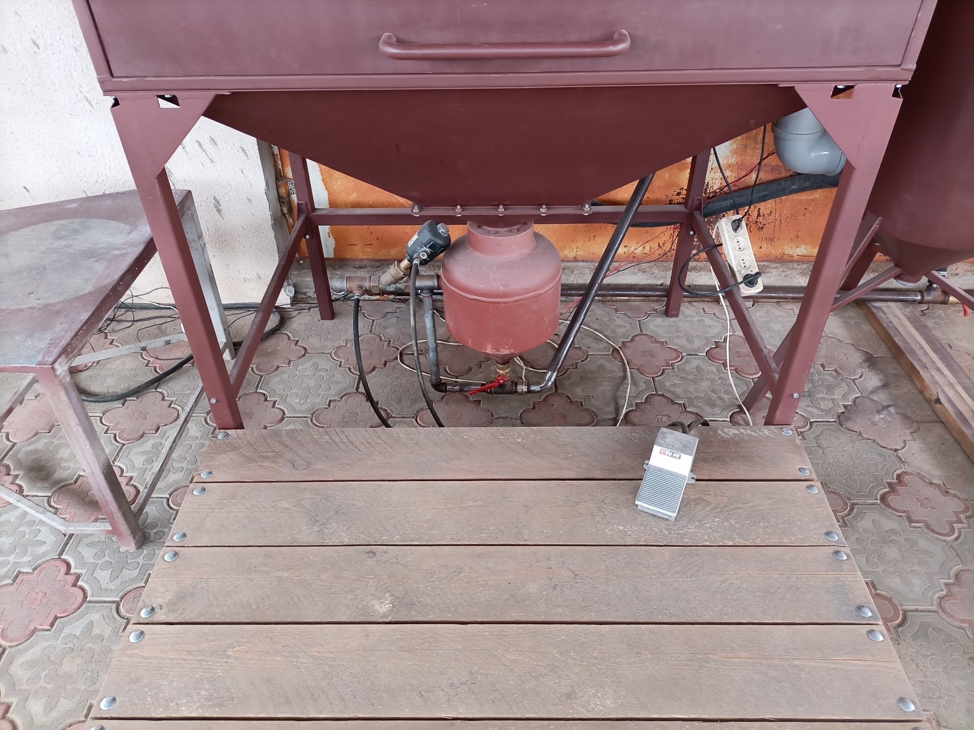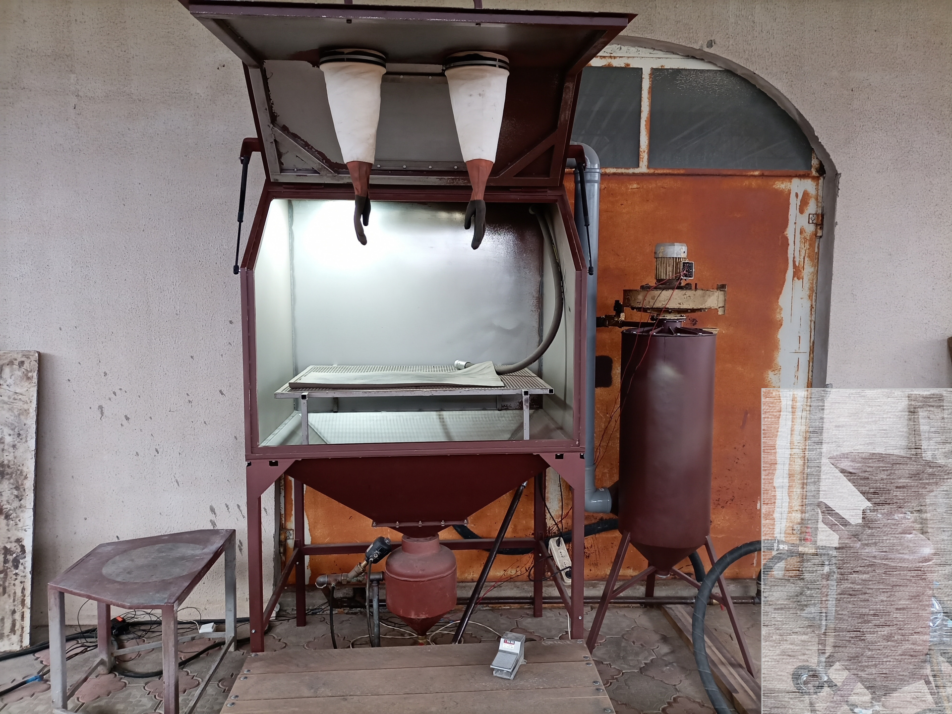 Камера напорного типа пескоструйная (пескоструй, дробеструй, дробеструйная) с напорным узлом на 13 литров (примерно 50-55 кг дроби) и дистанционным (пневмопедаль + пневмоклапан) управлением . Полностью разборная. После разборки поместится в Транспортер. Рабочие размеры камеры : ширина 1200 мм, глубина 900 мм, высота 1000 мм.