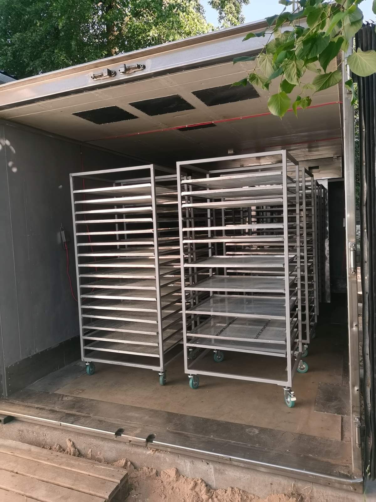 ООО «ОБИН» предлагает сушильную камеру для сушки овощей, фруктов, ягод, грибов - СКР-6ВНТ60, изготовленную на базе изотермического контейнера. Источником тепловой энергии является воздухонагреватель твердотопливный мощностью до 60 кВт с ручной загрузкой топлива (дрова, кусковые отходы деревообработки, брикеты). Управление процессом сушки осуществляется программными контролерами и датчиками температуры и влажности.