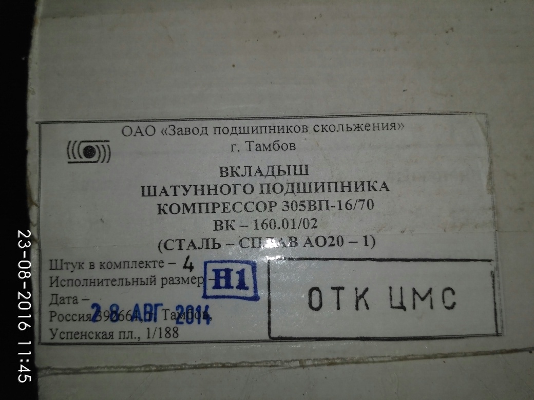 вкладыш ВК-160-01Р1 вкладыш шатуна ВК-16001Р1 шатунный подшипник ВК-160.01Р1 тонкостенный вкладыш ВК-160-01 Р1 биметалический вкладыш ВК-16001 Р1 сталеалюминиевый вкладыш ВК-160.01 Р1 шатунный вкладыш компрессора ВК-16001 Р1 вкладыш коленвала компрессора ВК-160.01Р1 вкладыш шатунного подшипника ВК-160-01 Р1 верхний вкладыш нижней головки шатуна компрессора ВК-160.01 Р1 вкладыш шатуна компрессора ВК-160-01 Р1 - деталь кривошипно-шатунного механизма, биметаллический, сталеалюминиевый, тонкостенный, предназначен для уменьшения трения шатуна с коленчатым валом замена в паре с нижним вкладышем шатунного подшипника ВК-160.02 Р1 ВК: вкладыш компрессора 160: наружный диаметр, мм 01: верхний: положение относительно нижней головки шатуна и коленвала Р1: 1-й ремонтный: параметры, размер запчасти для поршневых компрессоров ПО МКЗ Борец запчасти для поршневых компрессоров Компрессорного завода Борец доставка отгрузка отправка в любой город регион Украины доставка отгрузка отправка транспортными компаниями |