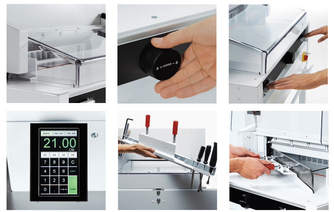 Опускание прижима стопы и лезвия ножа активируется последовательно двумя переключателями, расположенными по обеим сторонам резака. Управление процессом реза двумя руками обеспечивает максимальную безопасность оператора.