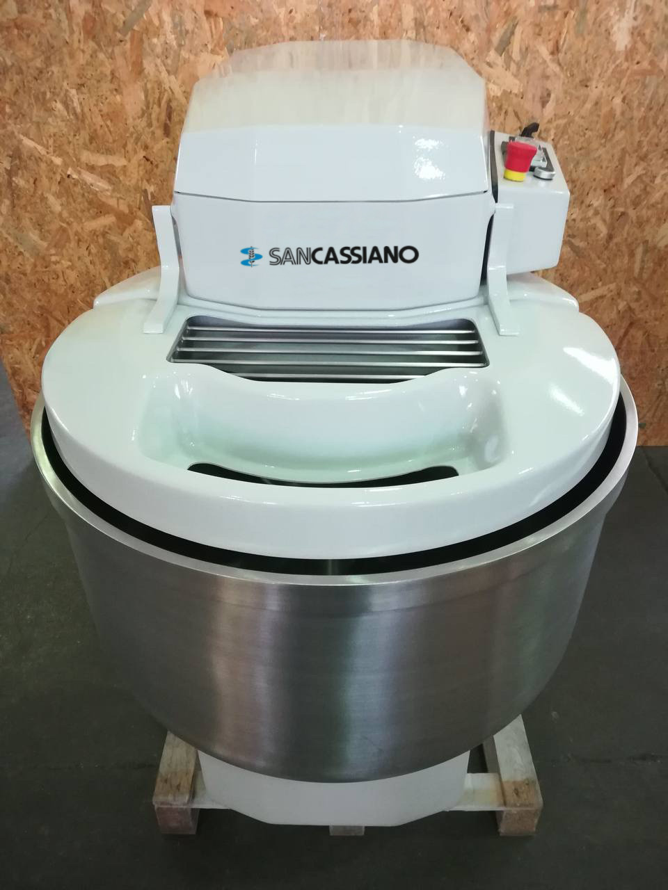 San Cassiano stationary spiral mixer for 130 kg of dough. The car after overhaul and repainting is in perfect condition. The spiral dough bowl has a motor with two speeds regulated by timers and a bowl motor with reverse direction.