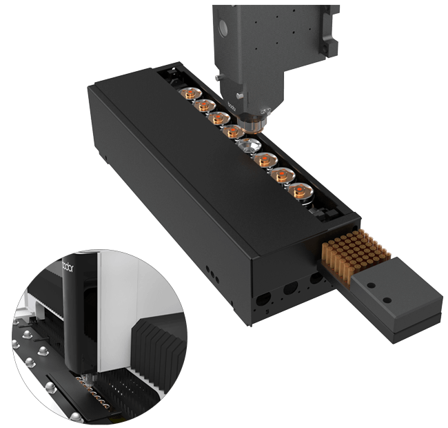 Использование расширенной и точной системы управления обеспечивает автоматическую замену сопел в соответствии с типом материала и толщиной листа, что устраняет необходимость ручной замены сопла, улучшает эффективность и надёжность обработки. Новая функция автоматической калибровки и очистки позволяет полностью автоматизировать калибровку лазерной головки и очистку сопел, что уменьшает монотонную ручную работу. Высокоточная система привода обеспечивает надежную точность и стабильность замены, гарантируя, что каждая замена является абсолютно безопасной. Полностью закрытая защита блока повышает безопасность деталей и персонала.