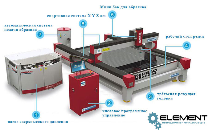 Станок гидроабразивной резки с ЧПУ состоит из рабочего стола, насоса, система управления ЧПУ с программным обеспечением для резки, режущей головки, система управления с помощью серводвигателями. Необходима автоматическая система подачи воды и абразива и система охлаждения. Также вы можете выбрать дополнительную систему автоматического удаления шлама по вашему запросу.