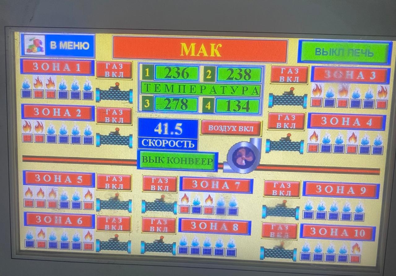 Сенсорная панель расположена на лицевой части, используется для управления режимами нагрева печи по зонам цифровое табло, показывающее значение установленных параметров печи, и кнопки «Пуск», «Стоп» и индикаторы включения и отключения горелок по зонам.