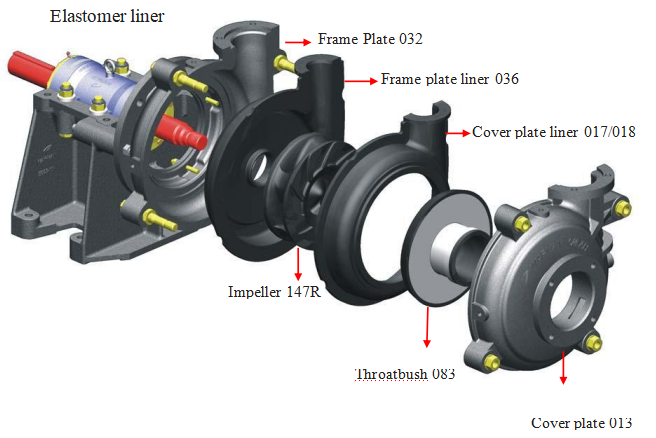 The frame plate for type MSH pump such as interchangeable, hard metal or pressure moulded elasomer liners. The impellers are made of hard metal or pressure moulded elastomer elastomer liners. The frame plate liner. The frame plate liner and impeller for MSHH pump are adopted of hard metal only.