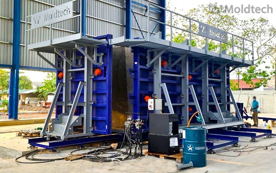 Внешние стенки формы имеют жесткую усиленную конструкцию и скользят по направляющим, открывая и закрывая форму в сборе, приводимую в действие гидравлическими цилиндрами. Эти внешние стороны формы также оснащены механическими системами блокировки для надежного крепления стенок друг к другу, чтобы обеспечить плотную сборку формы и предотвратить любые протечки.