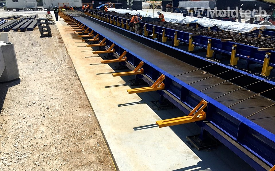 Эти столы включают в себя 2 продольные полосы опалубки высотой по требованию заказчика. Боковые полосы крепятся к столу с помощью петель, а также фиксируются и ослабляются растяжками dywidag. Возможна также поставка регулируемых по высоте лент.