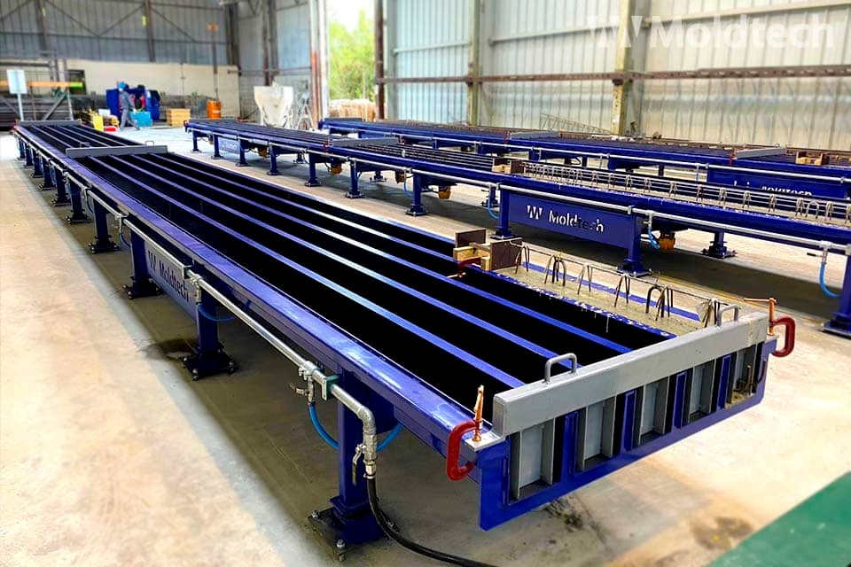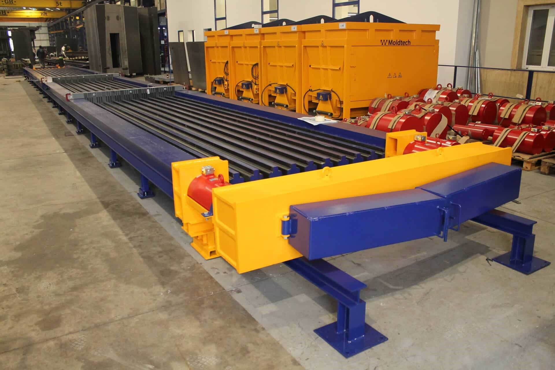 Этот проект включает в себя изготовление, установку и сборку 2-х кассетных форм для предварительно напряженных балок (или ригелей) длиной 62,5 метра и мощностью предварительного напряжения 600 тонн. Каждая форма имеет 2 производственные линии и включает в себя трубы для подключения отопления, а также электрическую вибрационную систему для облегчения процесса заливки и схватывания бетона. Кроме того, обе формы имеют минимальную конусность, что упрощает процесс извлечения готовых изделий из формы.