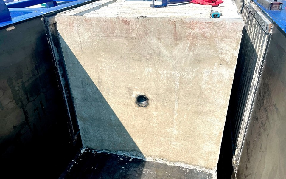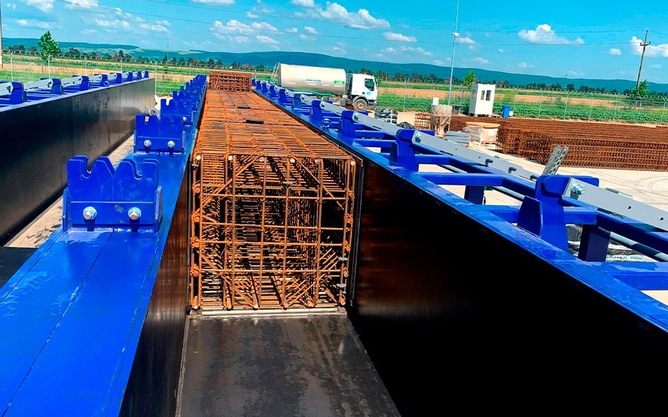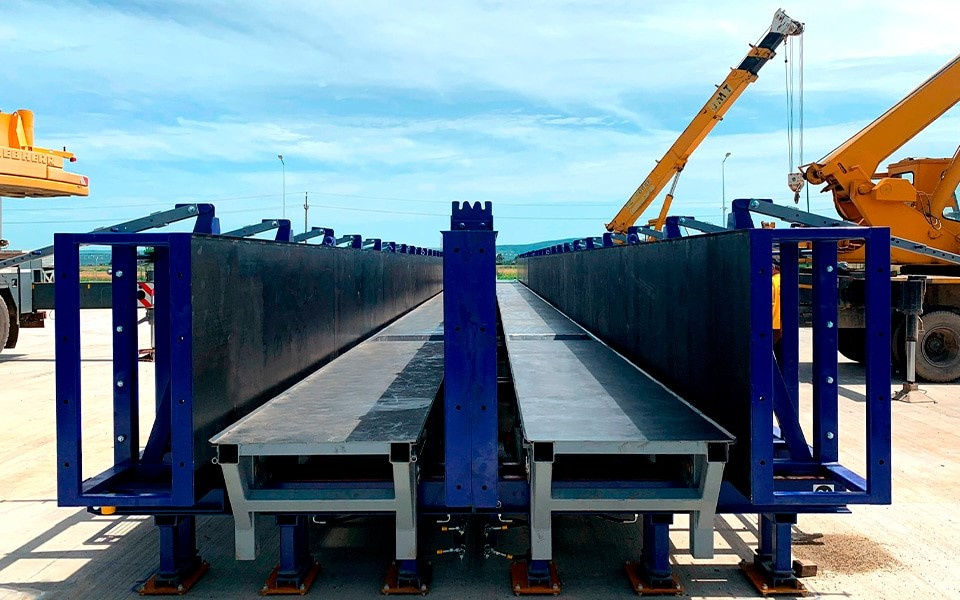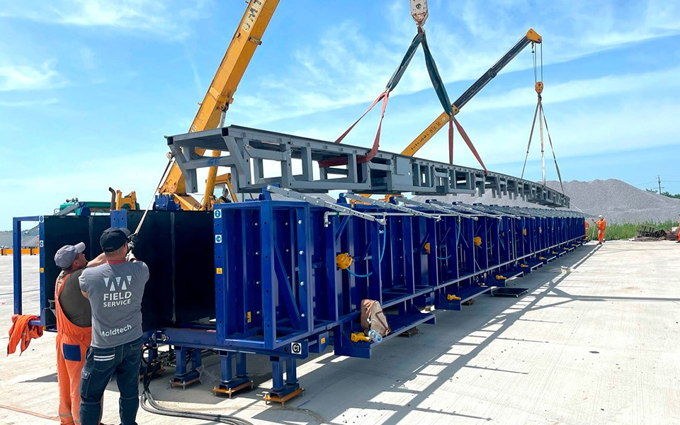 Одна из недавно доставленных форм представляет собой двойную форму для колонн общей длиной 34 метра. Для обеспечения более эффективной и комфортной работы форма оснащена гидравлической системой, которая позволяет активировать ее открытие и закрытие с электрического пульта управления. Движения выполняются очень плавно благодаря нейлоновым скользящим дорожкам, расположенным в основании формы. После завершения закрывающего движения имеются механические замки, которые прижимают стороны формы к опорной плите перед заливкой бетона. Этот зажим в сочетании с прочными боковыми стенками формы и верхними фланцами обеспечивает абсолютную ровность отливки.