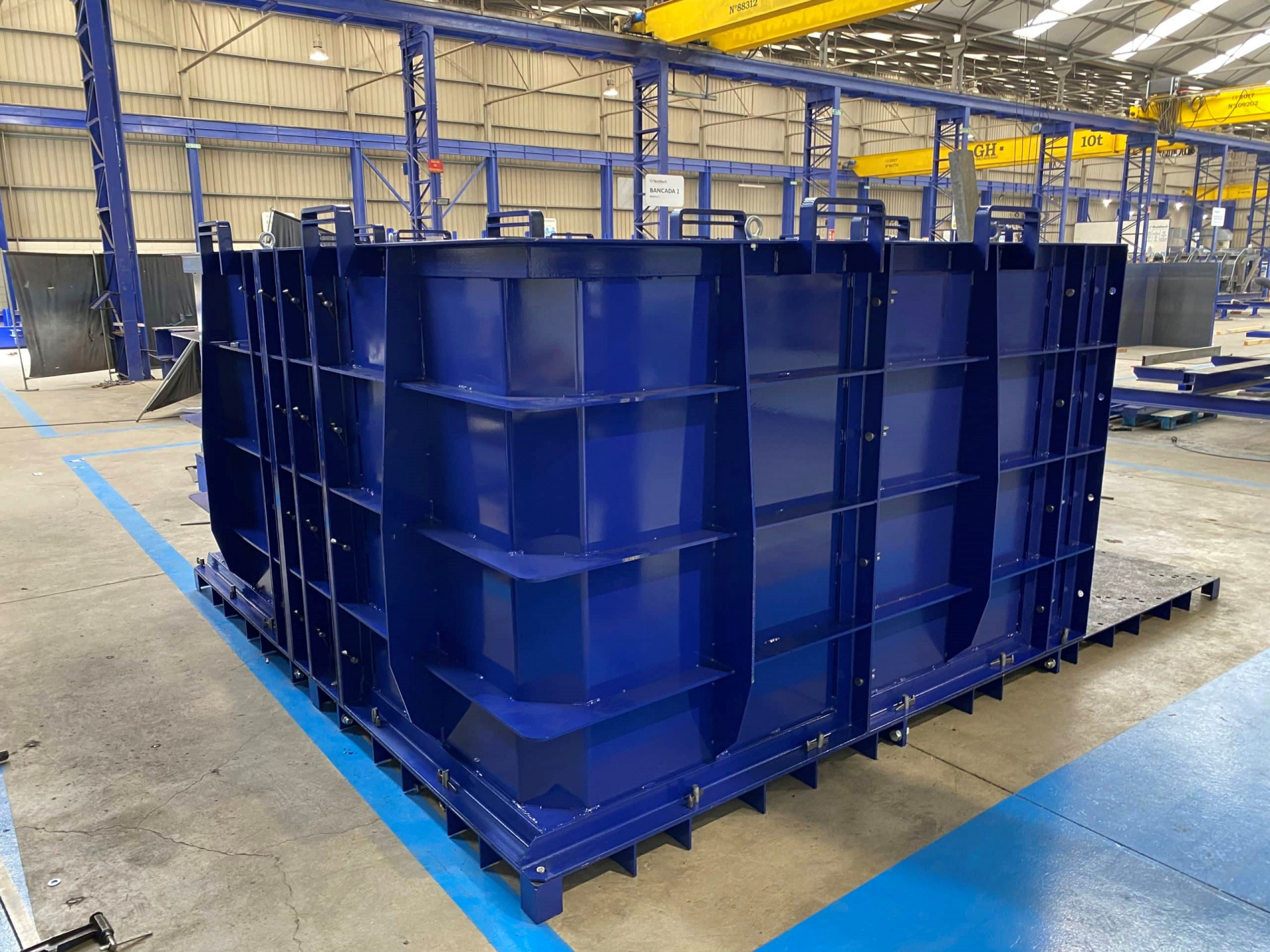 Внутренняя и наружная опалубки соединены с помощью болтов и клиньев, каждая из них может быть разделена на две части и снята при открывании формы, что упрощает процесс производства нескольких изделий с одинаковыми размерами.