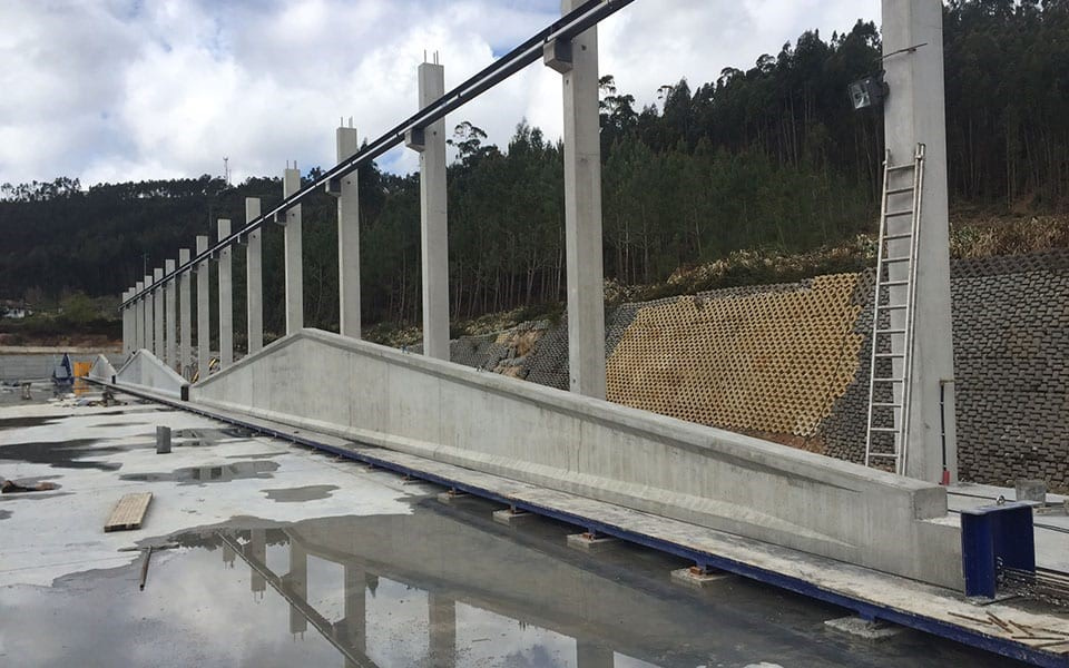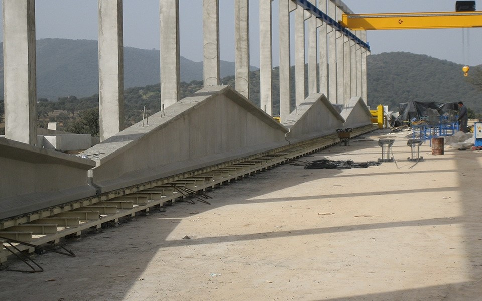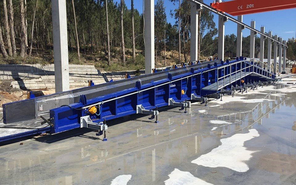 Для это продольные борта балки можно модулировать таким образом, что центральные модули удаляются или добавляются между двумя концами. Указанные модули собираются с помощью болтовых и гаечных соединений и сконструированы таким образом, чтобы обеспечить наилучшую целостность и герметичность формы, тем самым сводя к минимуму возможные следы на предварительно напряженной двухскатной балке.